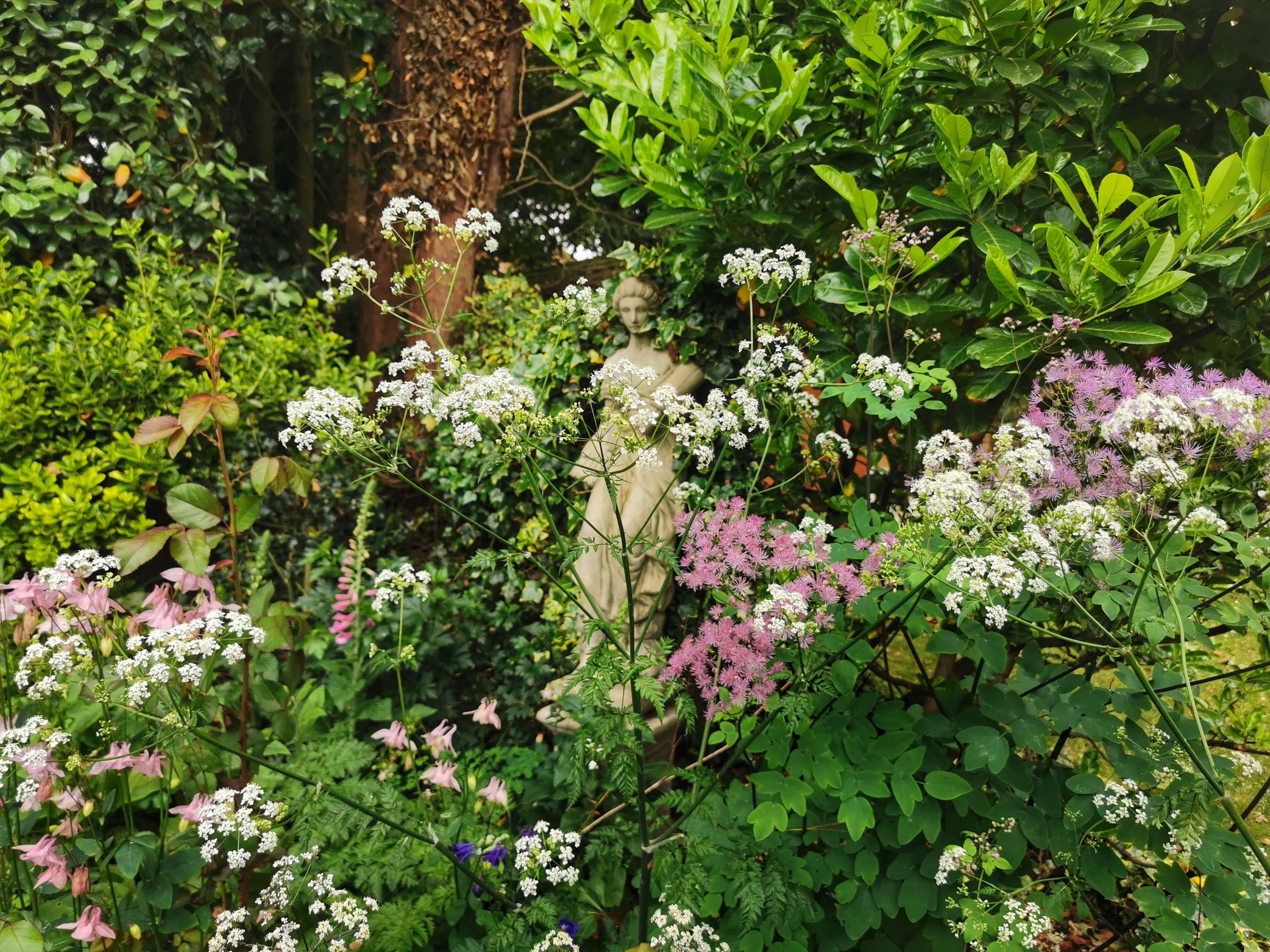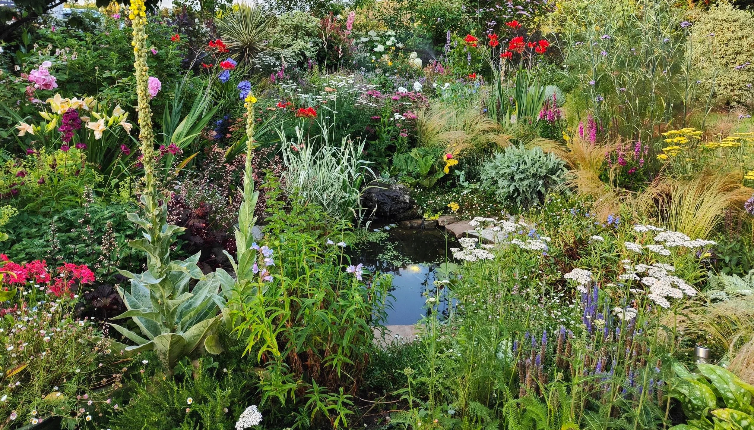 Fallen leaves are left on beds to protect soil and provide habitats. Dead stems and seed heads are kept through winter to support insects and birds and to maintain structure and beauty.