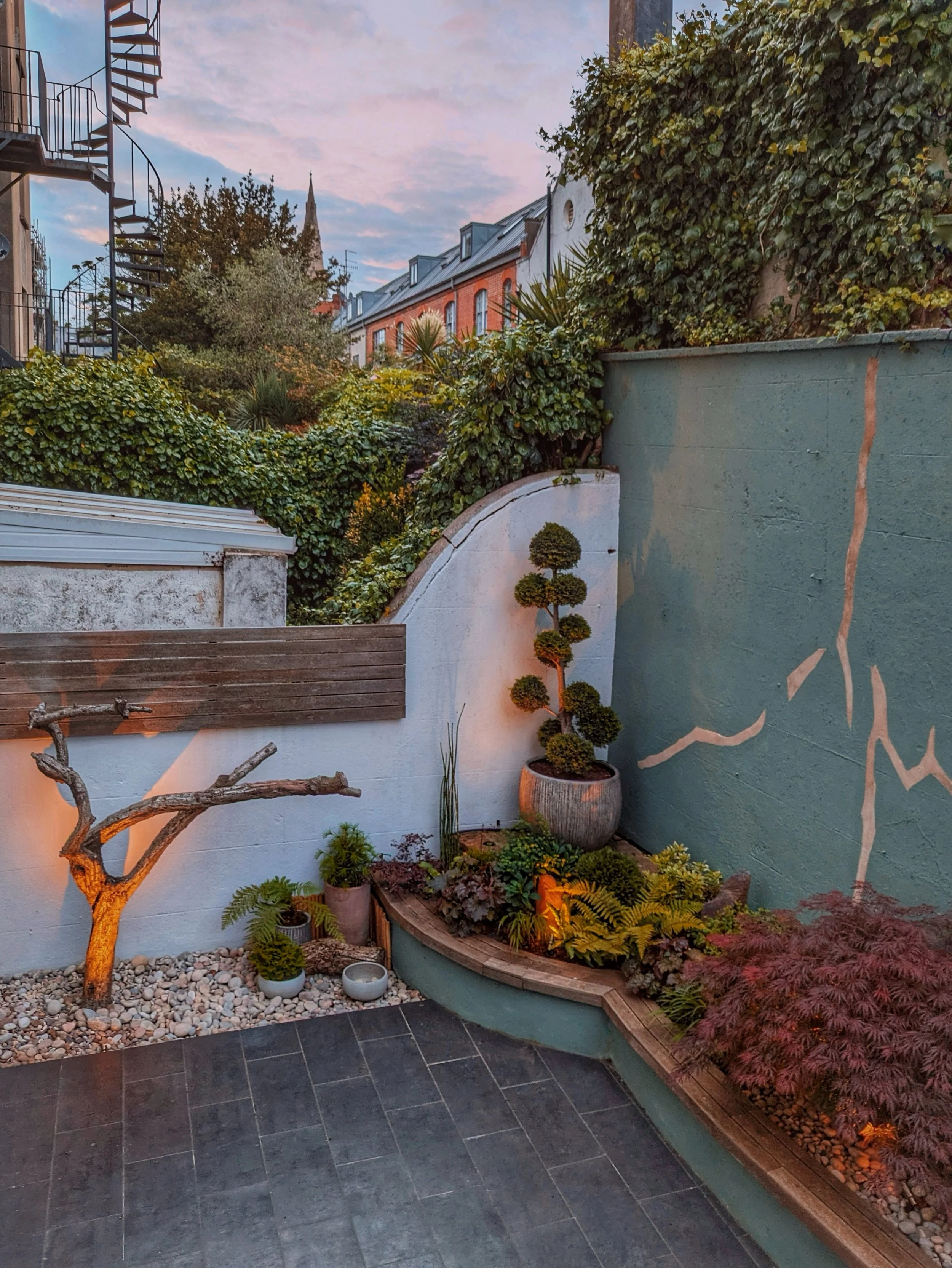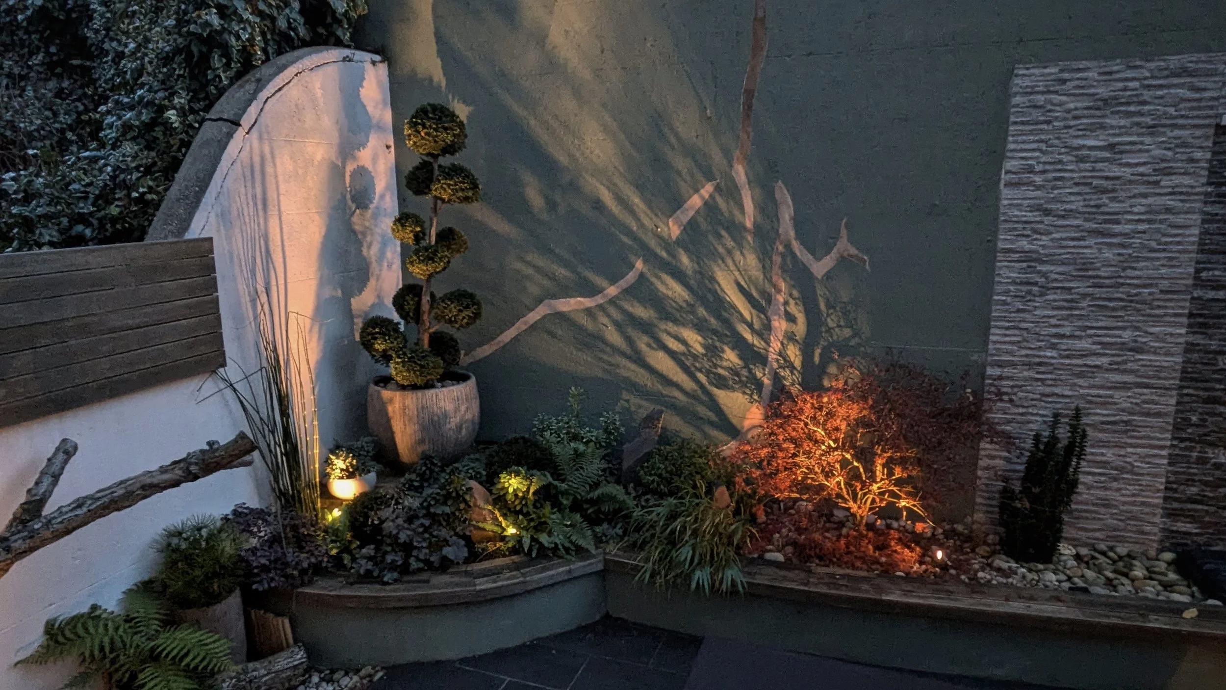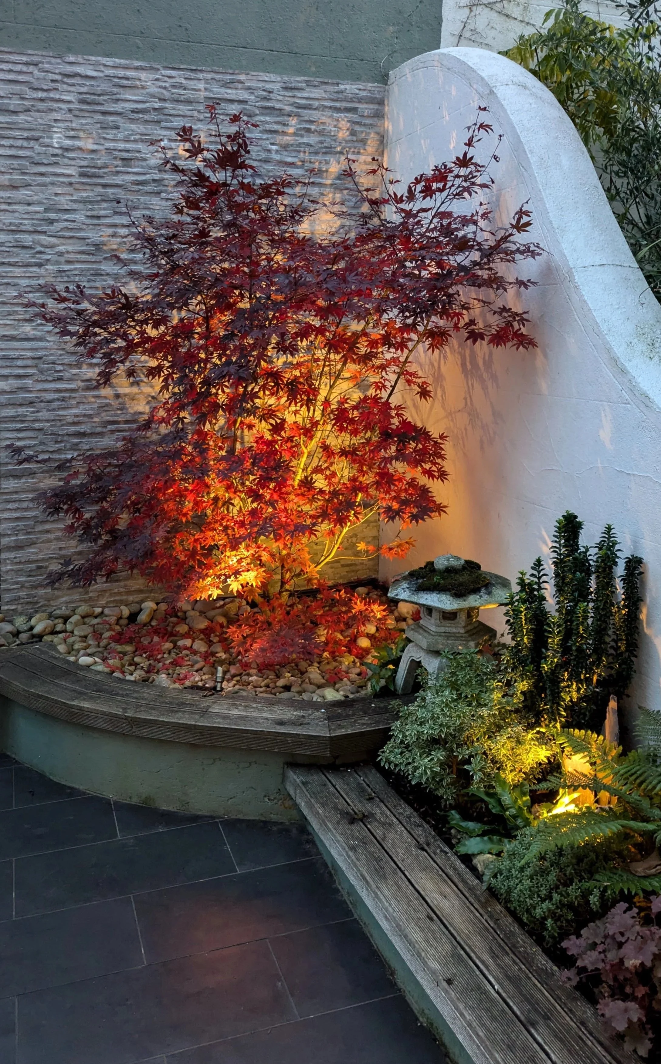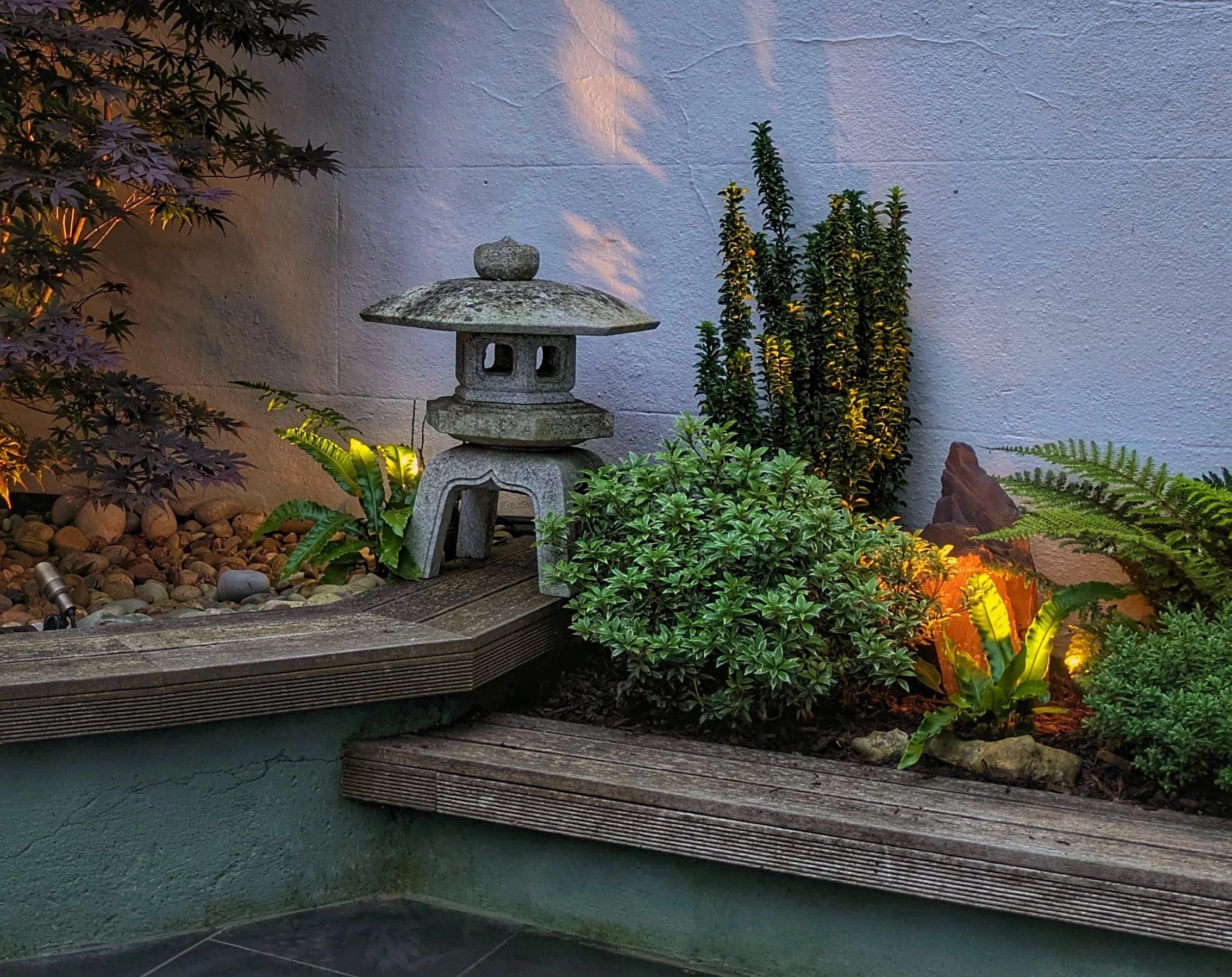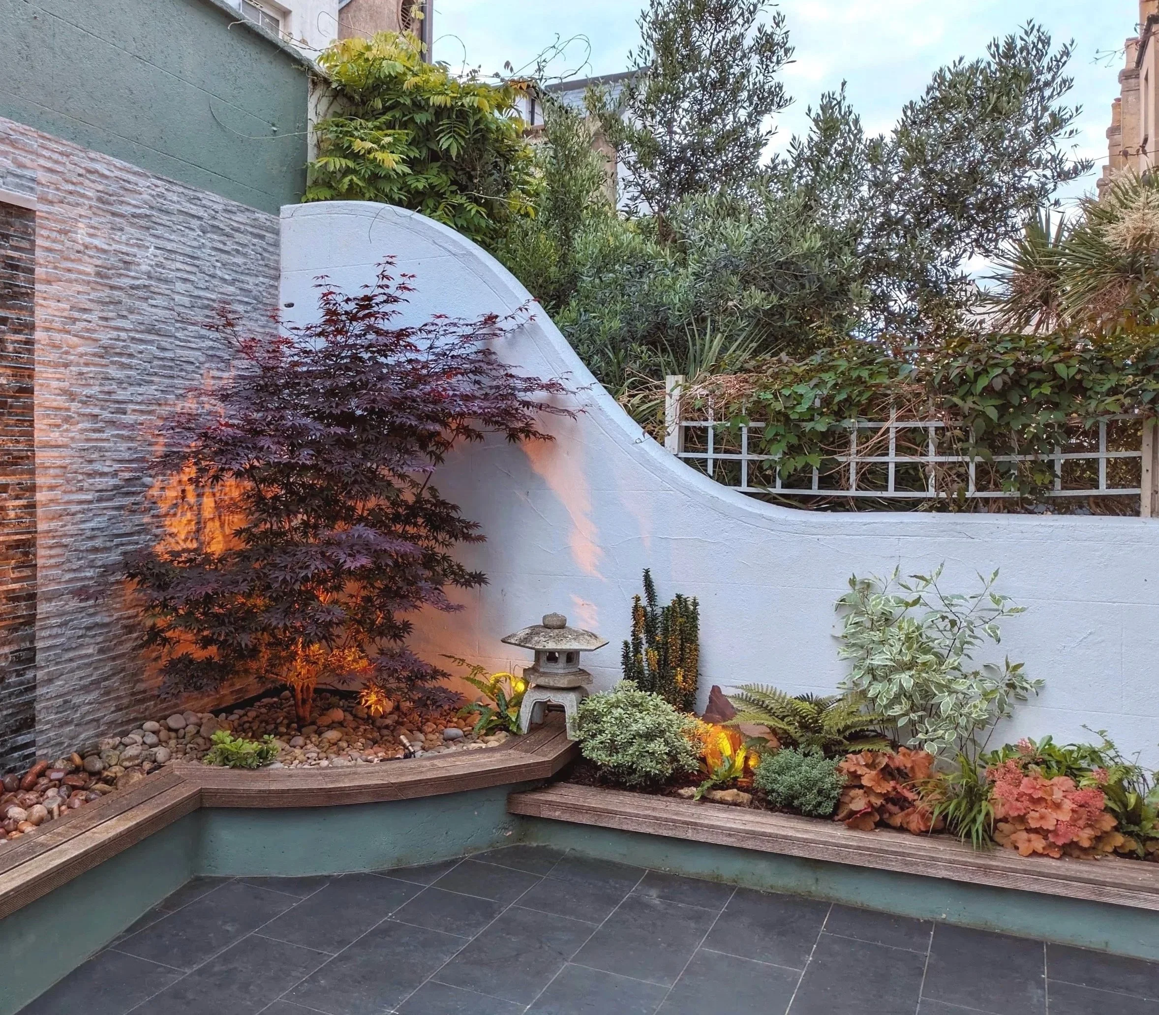 Hard landscaping and decoration by Cotton & Sons. Lit by Garden Spark Lighting.